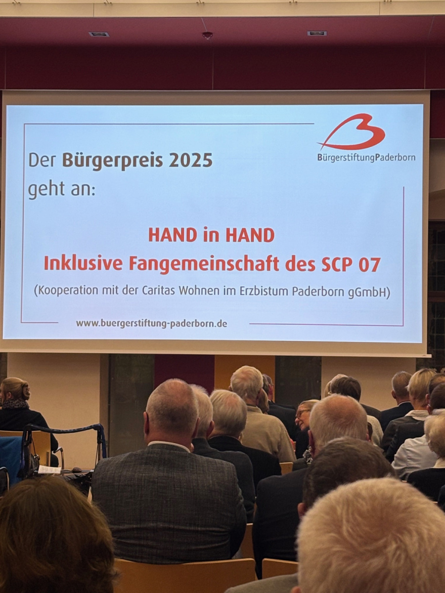 Der Preis der Bürgerstiftung wurde geteilt, wie so oft, und den zweiten Teil hat das Projekt „Hand in Hand – Inklusive Fangemeinschaft des SC Paderborn“ bekommen. Wir waren beeindruckt, was dort für ein tolles Engagement herrscht.
